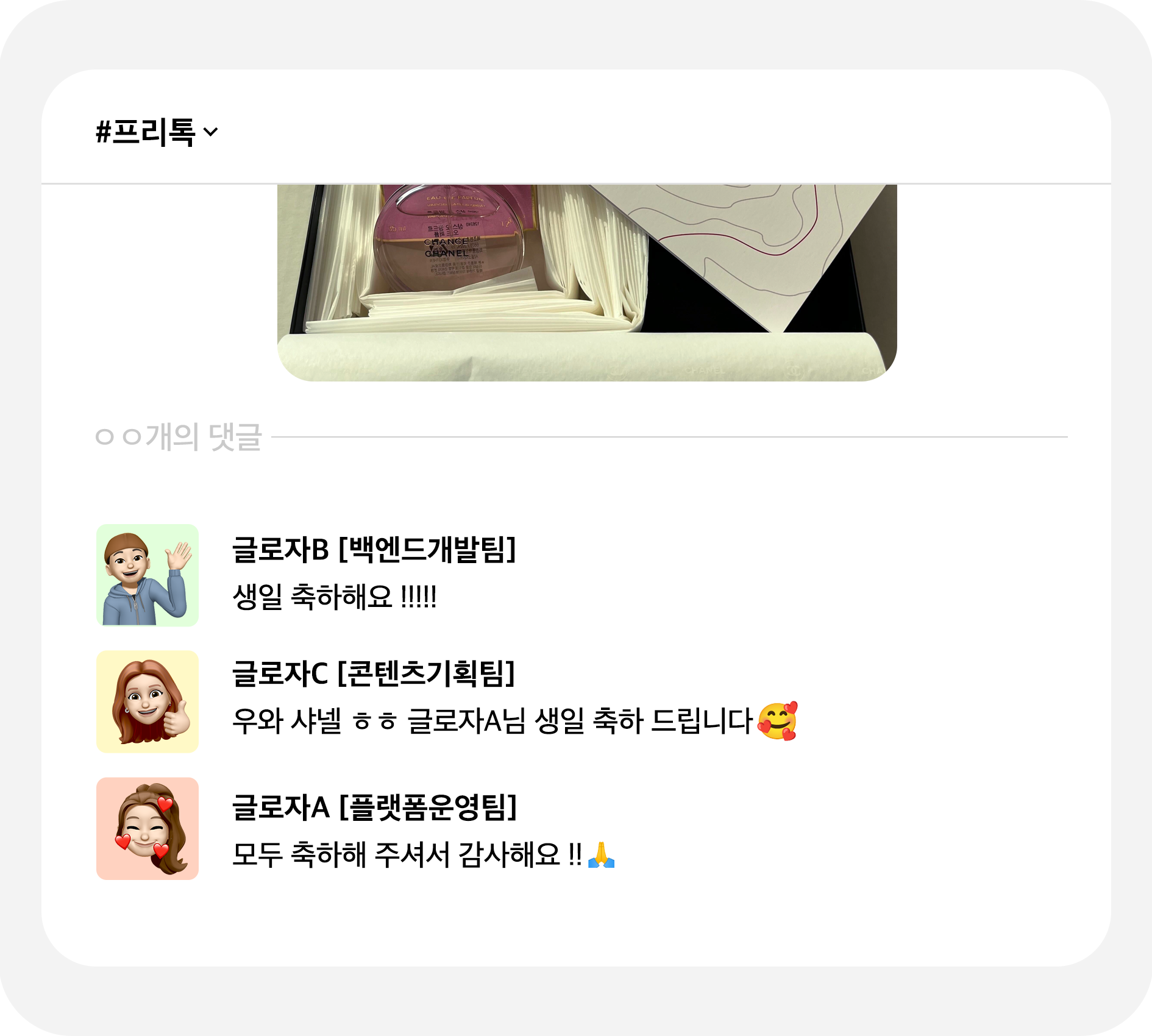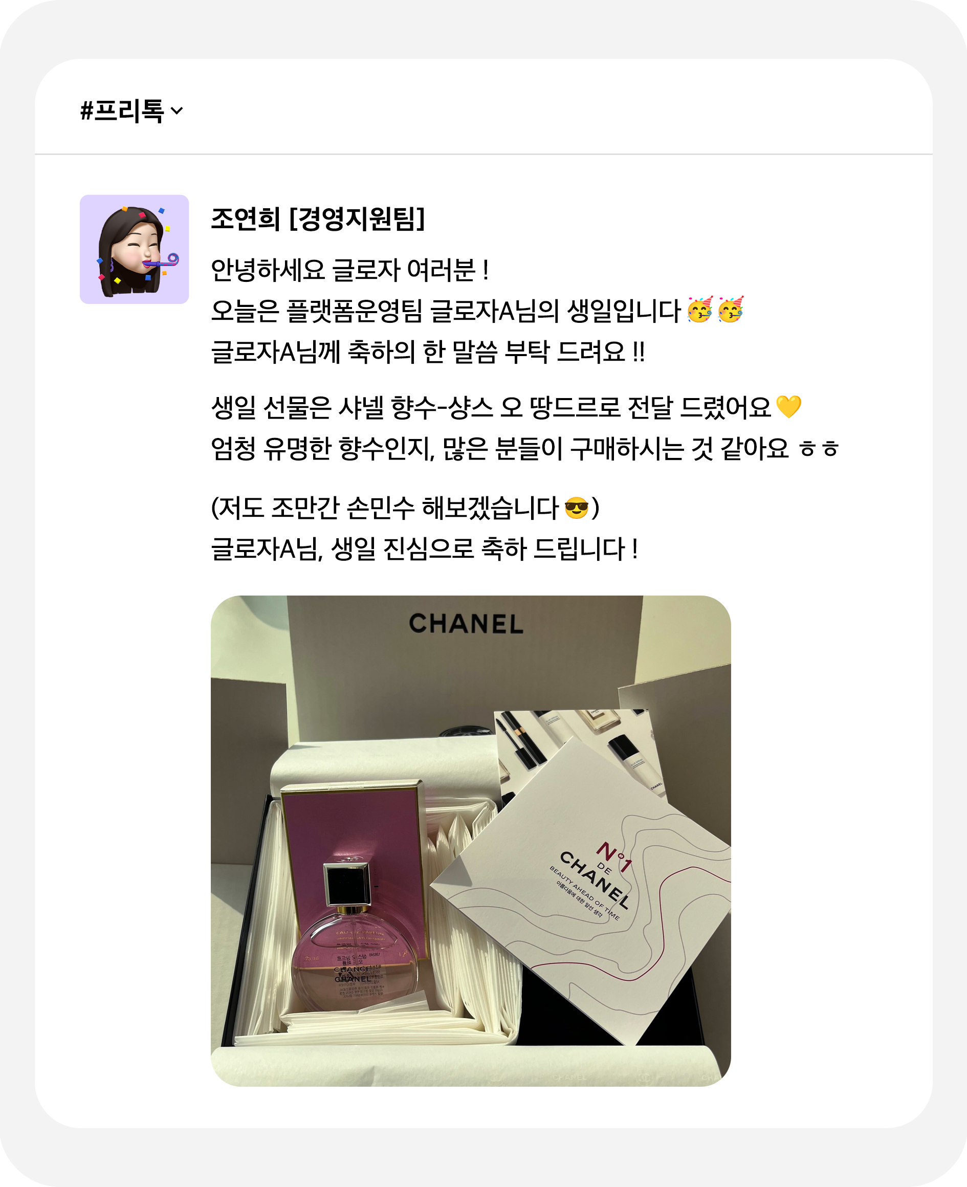 생일 당일, 전체 글로자가 함께 있는 #프리톡 채널에 생일 축하 공지 메시지를 올리고 있어요.