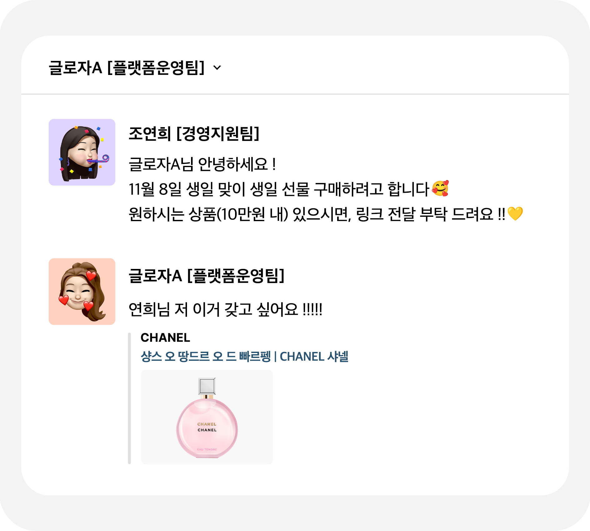 생일 약 일주일 전부터, 희망하는 생일 선물 조사를 위해 SLACK으로 링크를 요청 드려요.